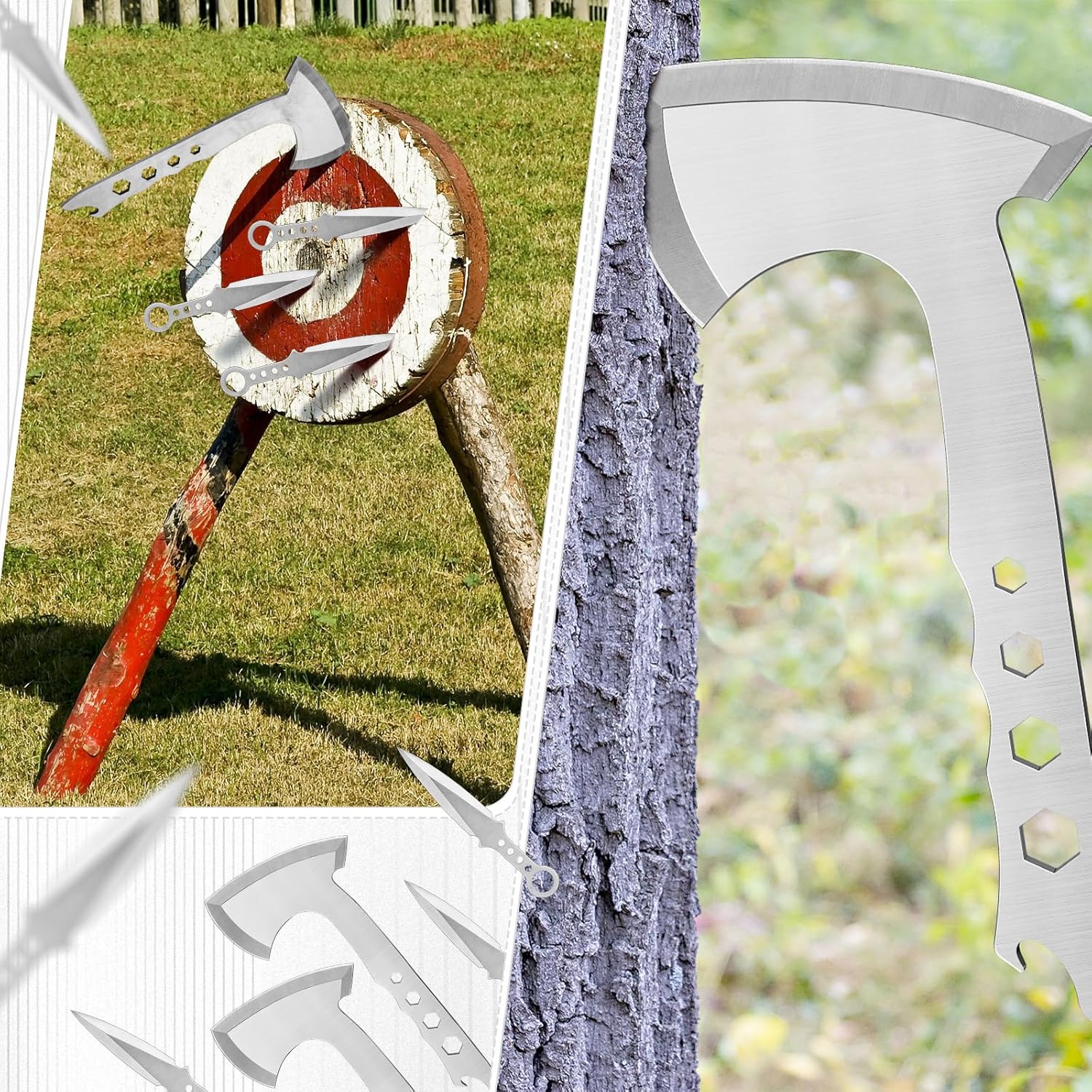 Features: Convenient nylon protective cover: The throwing axe set comes with a nylon protective cover that can store up to 3 throwing axes. It provides a handy storage solution when the axes are not in use. It acts as a portable carry on for outdoor adventures and also ensures safety for the blade and your hands. Easy to use: The three sided sharp blade is capable of easily hitting the target. Coupled with an ergonomic handle that offers balance and comfortable grip, this set is ideal for both beginners and professional throwers who aim for precision. Specifications: Material: stainless Stee Color: sliver Size: axes 10 inches/ 25.5cm, knives 2.6 inches/ 6.6cm Package includes: 6 x Axes knives Set Notes: Manual measurement, please allow slight errors on size. The color may exist a slight difference due to different screen displays.