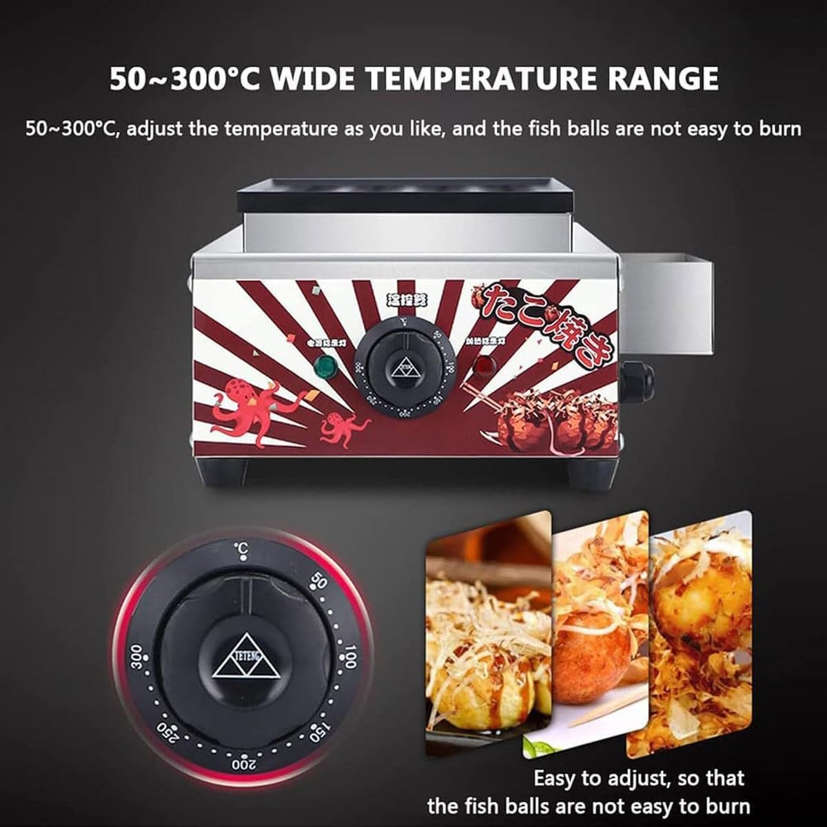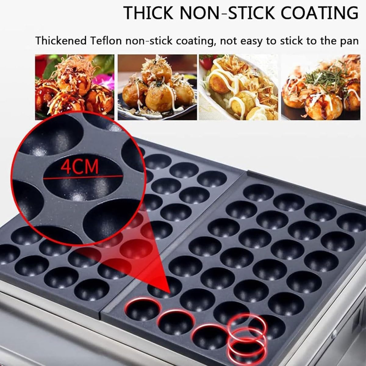 Non-stick coating, easy to clean, with indicator switch, aluminium die-casting baking tray, one time can bake 56 pills at the same time Cold touch program anti-scald base, the use of safe anti-overheating protection. Machine overheating automatic power-off, the temperature drops and then automatically start heating, so that the baking tray is always in a more ideal temperature range.Specification:Name: Commercial Takoyaki MakerColor: GrayMaterial: Stainless SteelPower: 2000W*2Temperature: 50-300°CTemperature Control: Dual independent temperature controlHeating Method: electro-thermalNumber of Balls: 56Circle diameter of each hole: 40MMCircle depth of each hole: 25MMSize: 435*437*165mmWeight: 8 kgPacking List:1 * Commercial Electric Takoyaki Machine1 * Funnel + Funnel Stand2 * Takoyaki Ball Needle1 * Brush2 * Squeeze Sauce Bottle1 * Egg BeaterNote:1.Due to differences in light, environment, monitor, etc., it is normal that there is a certain color difference between the product and the picture.2.If you have any questions or concerns, please contact us! we will reply you within 24 hours!