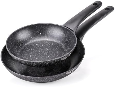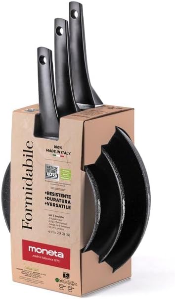 Forged aluminium pan set with non-stick stone effect coating free from PFOA, BPA and Nickel. Suitable for all heat sources, including induction. 100% Made in Italy.