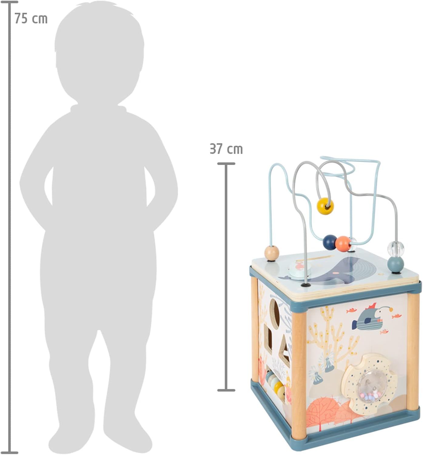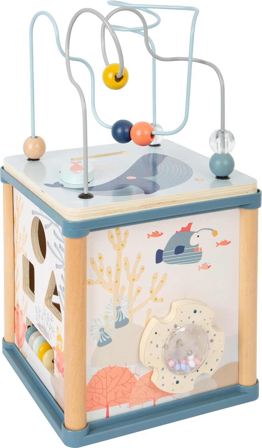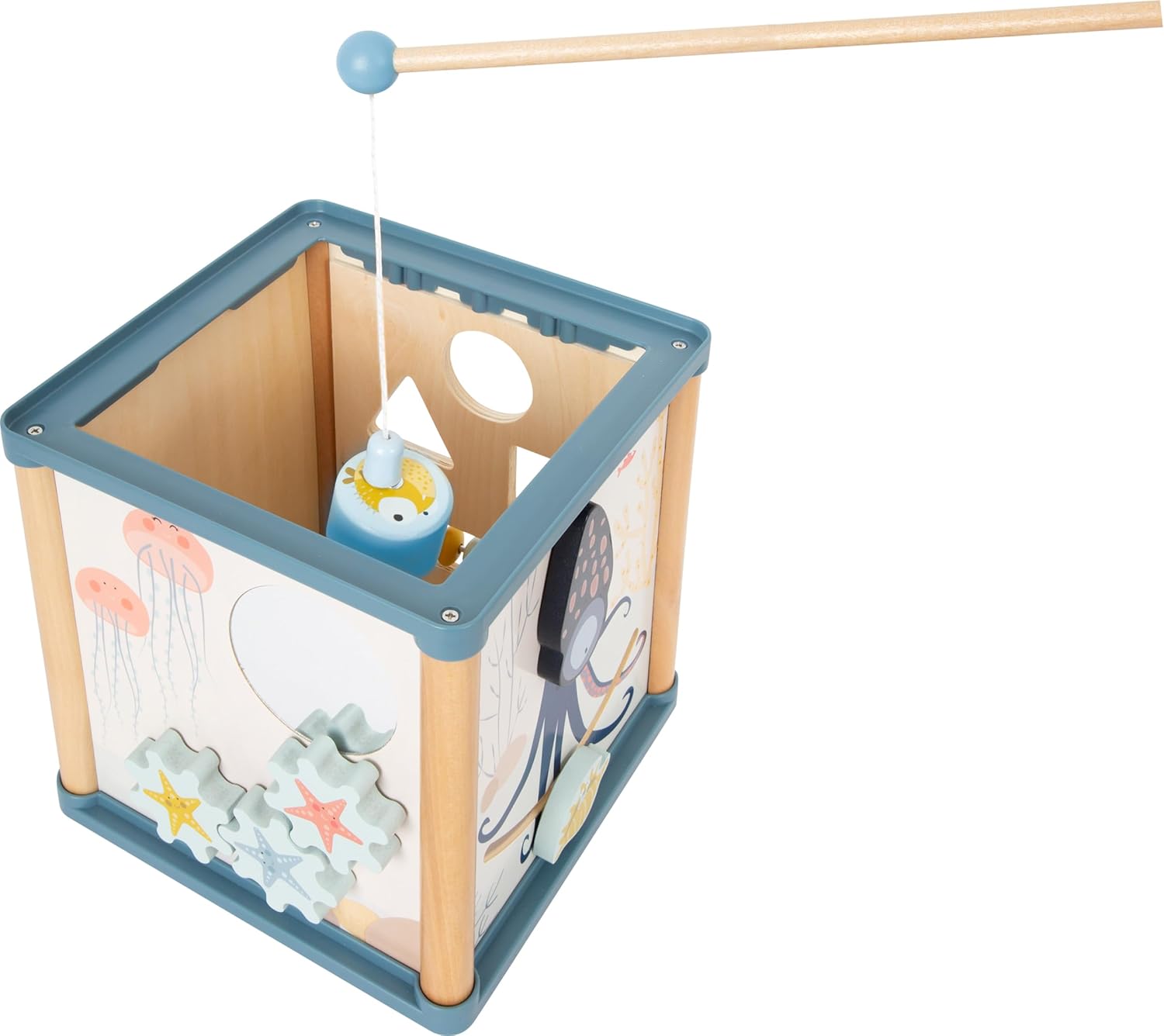 So much go under water. With motor skills loop, shape insert, sliding maze game, gear game and rattle, this wooden motor skills cube is an all-rounder on five playable sides. The lovingly designed backdrop with maritime underwater world encourages storytelling and lets children discover the world of sea creatures in a playful way. The octopus, whose head wobbles fun thanks to the spring mechanism. The rotating porthole with colourful rattle balls and the mirror are also special game highlights. Variety is provided by the included fishing rod with which the three magnetic plug-in blocks can be fished. Great fun for young children who develop motor skills and cultivate patience.